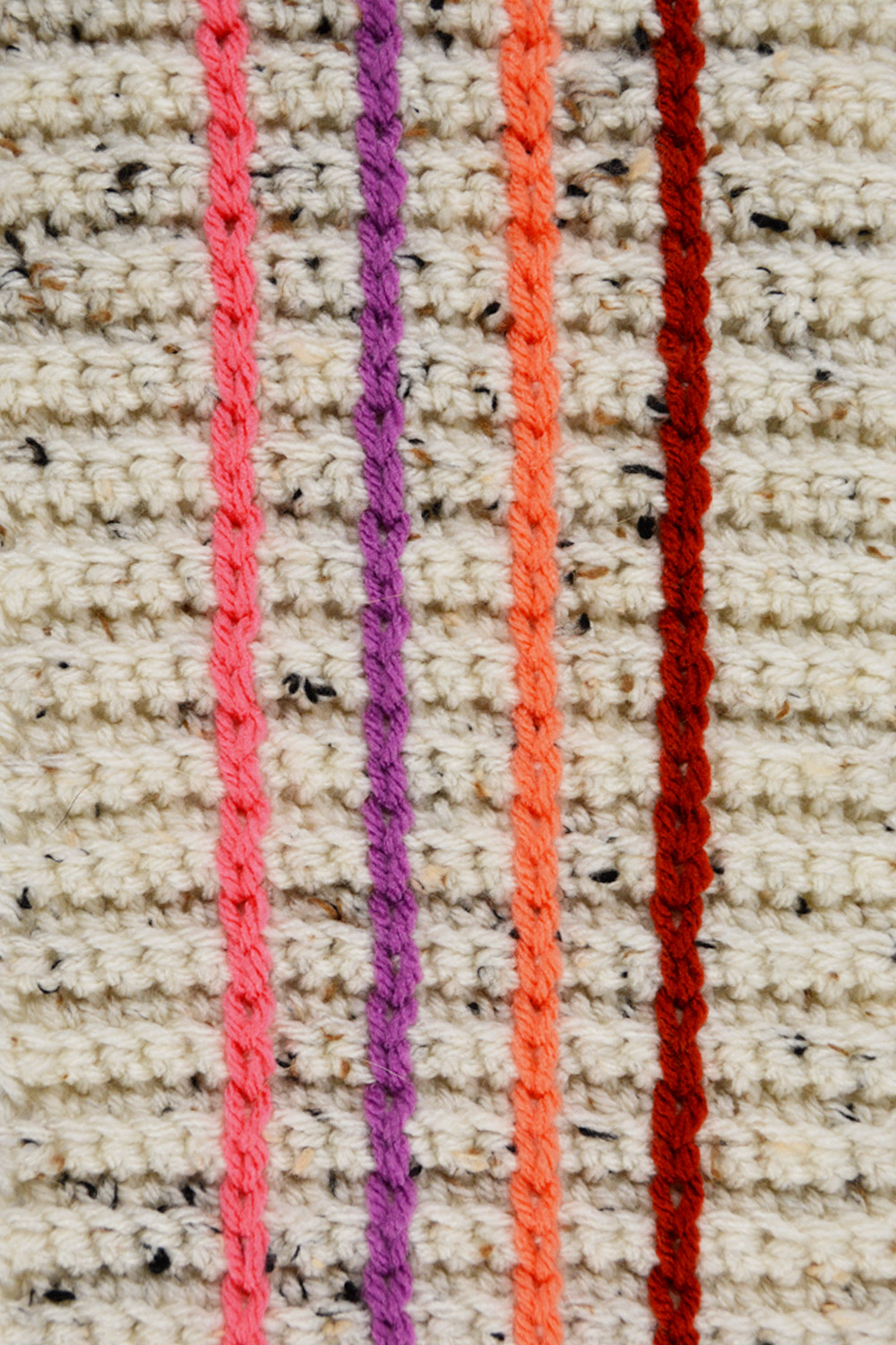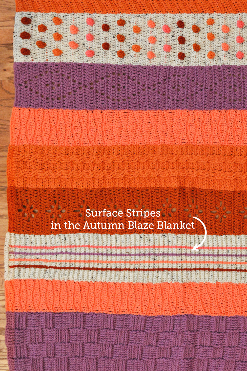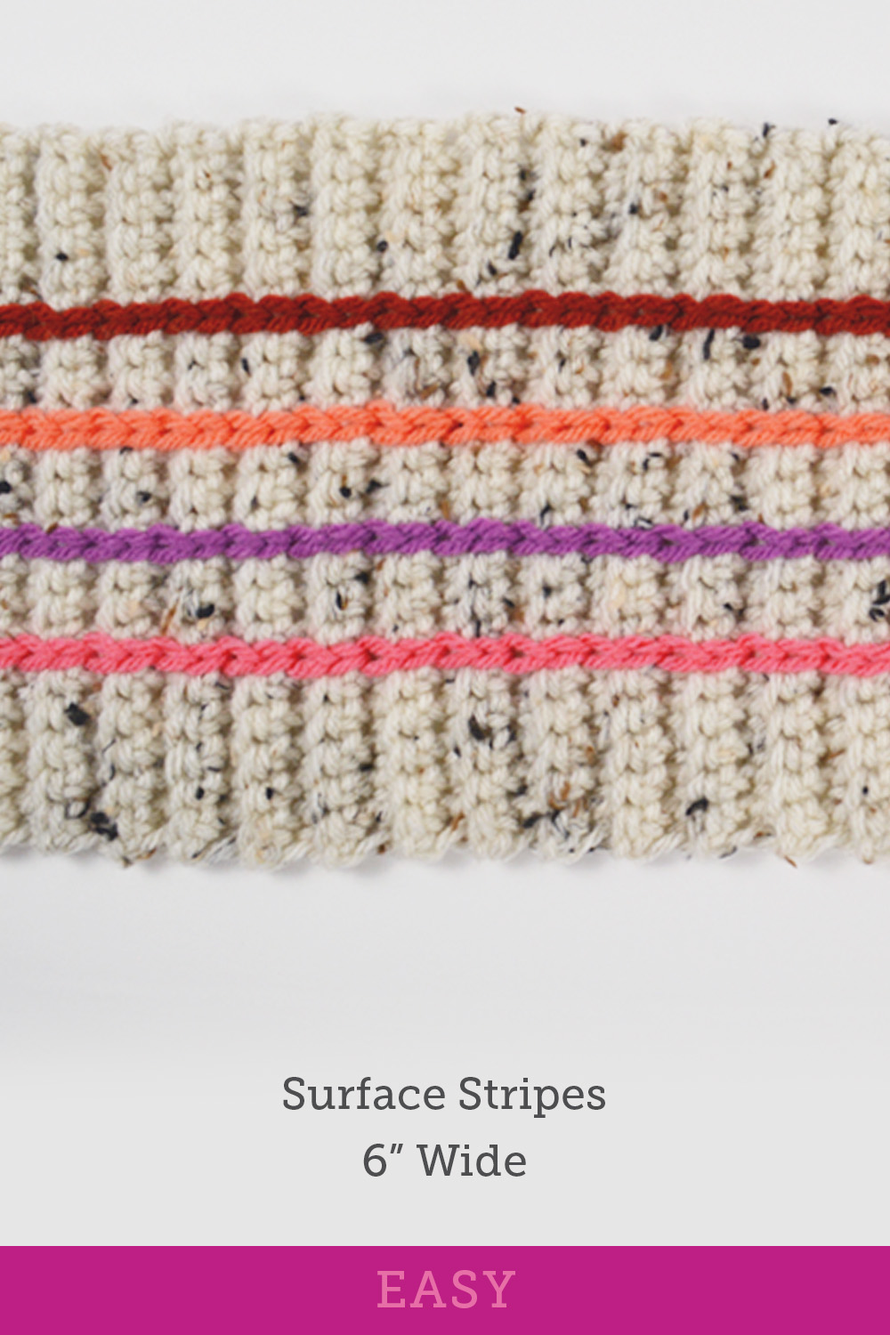 Surface Stripes is a great way to bring your accent colors together. If you have a bright pop of color that is too bright to be a whole panel, this is a great way to include it. And learn to surface crochet with the slip stitch to add colorful stripes after the base panel is crocheted.