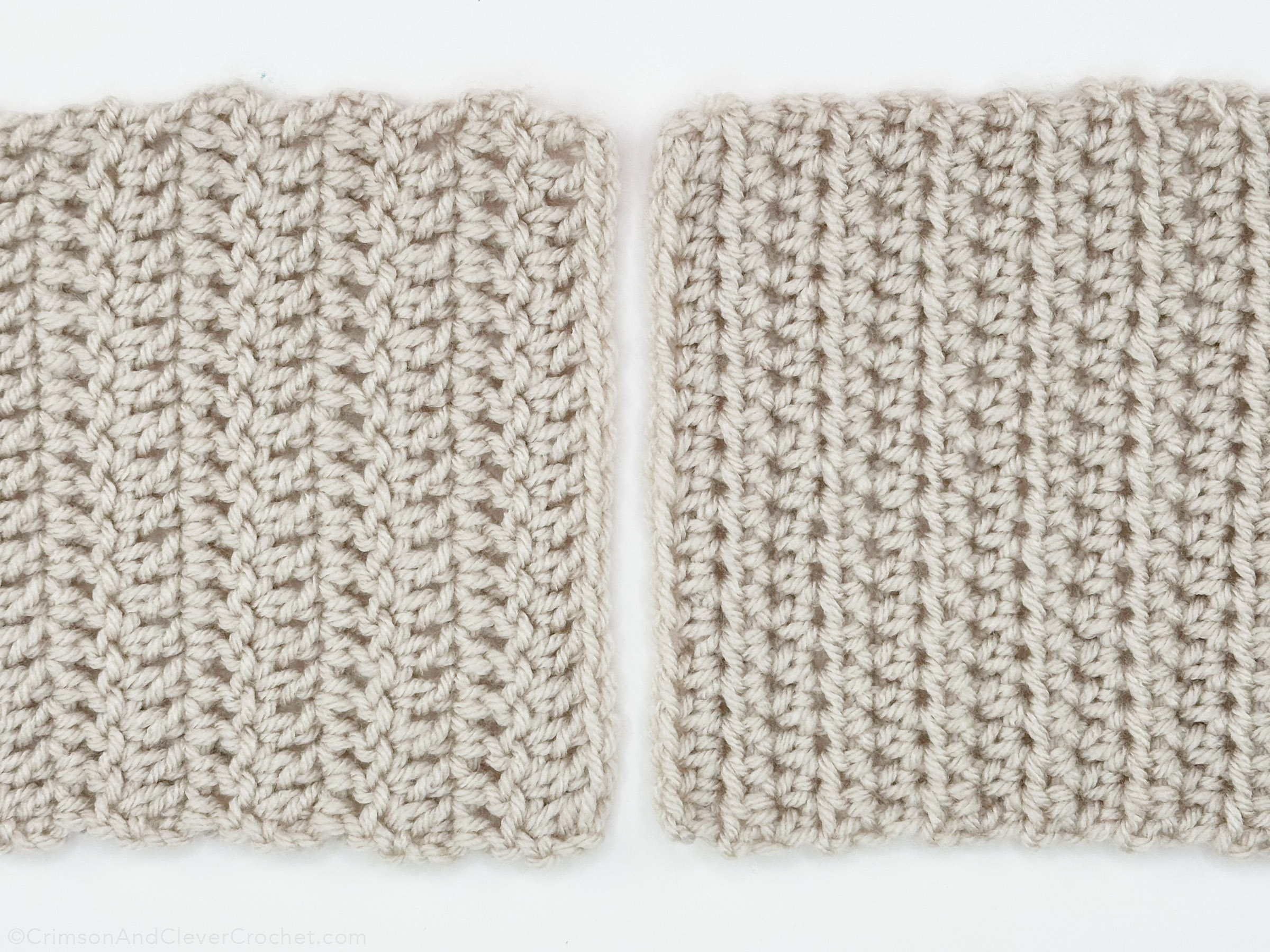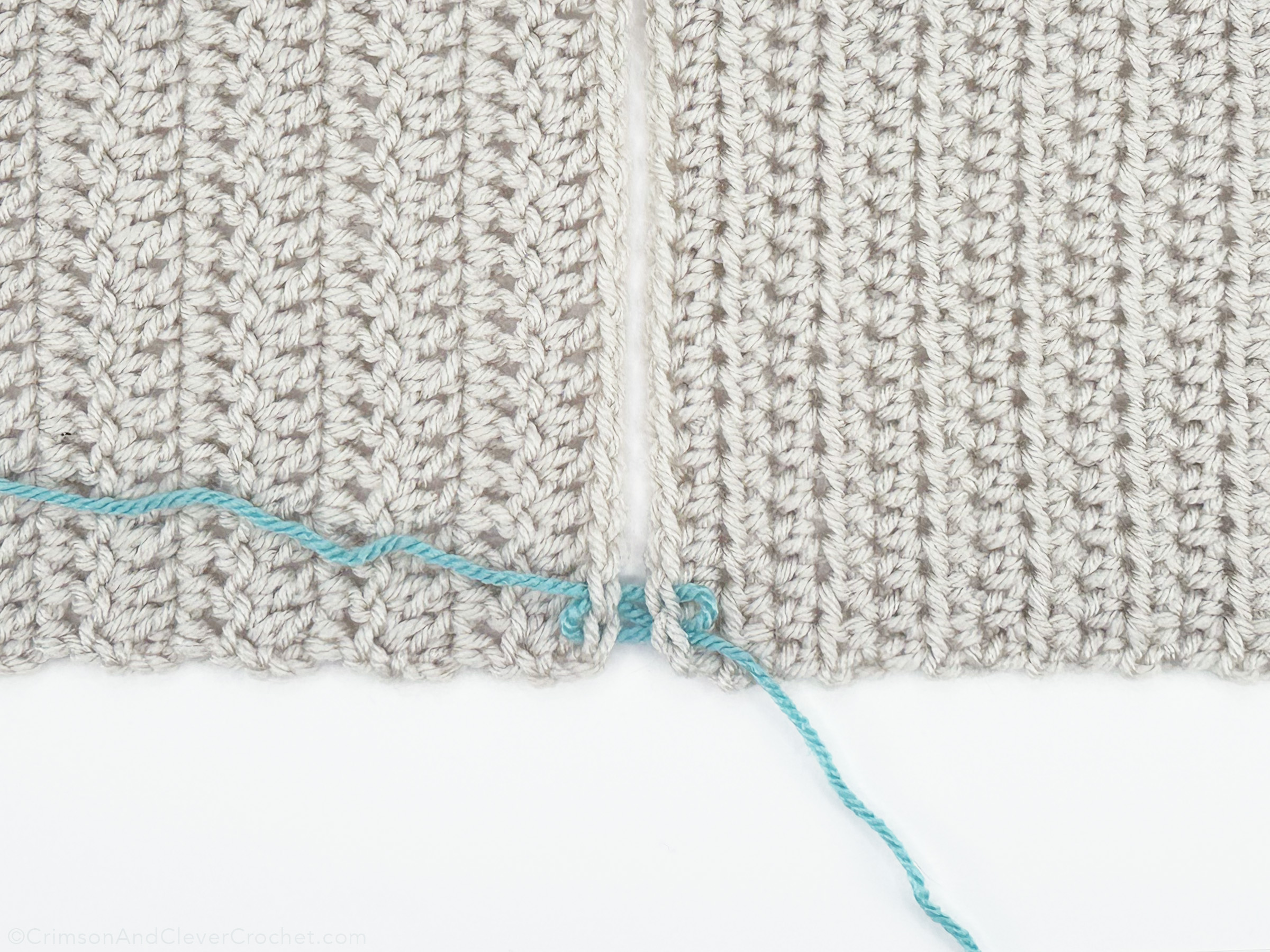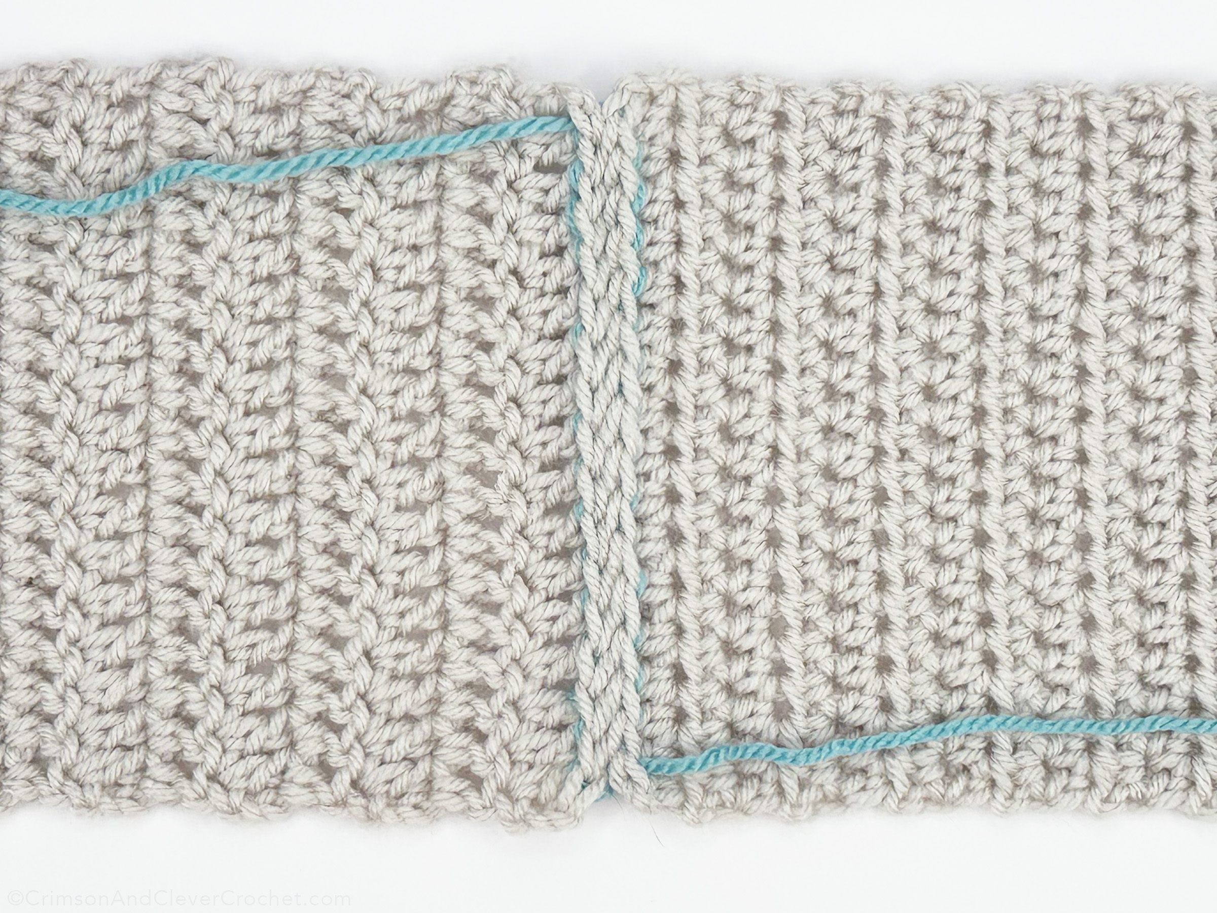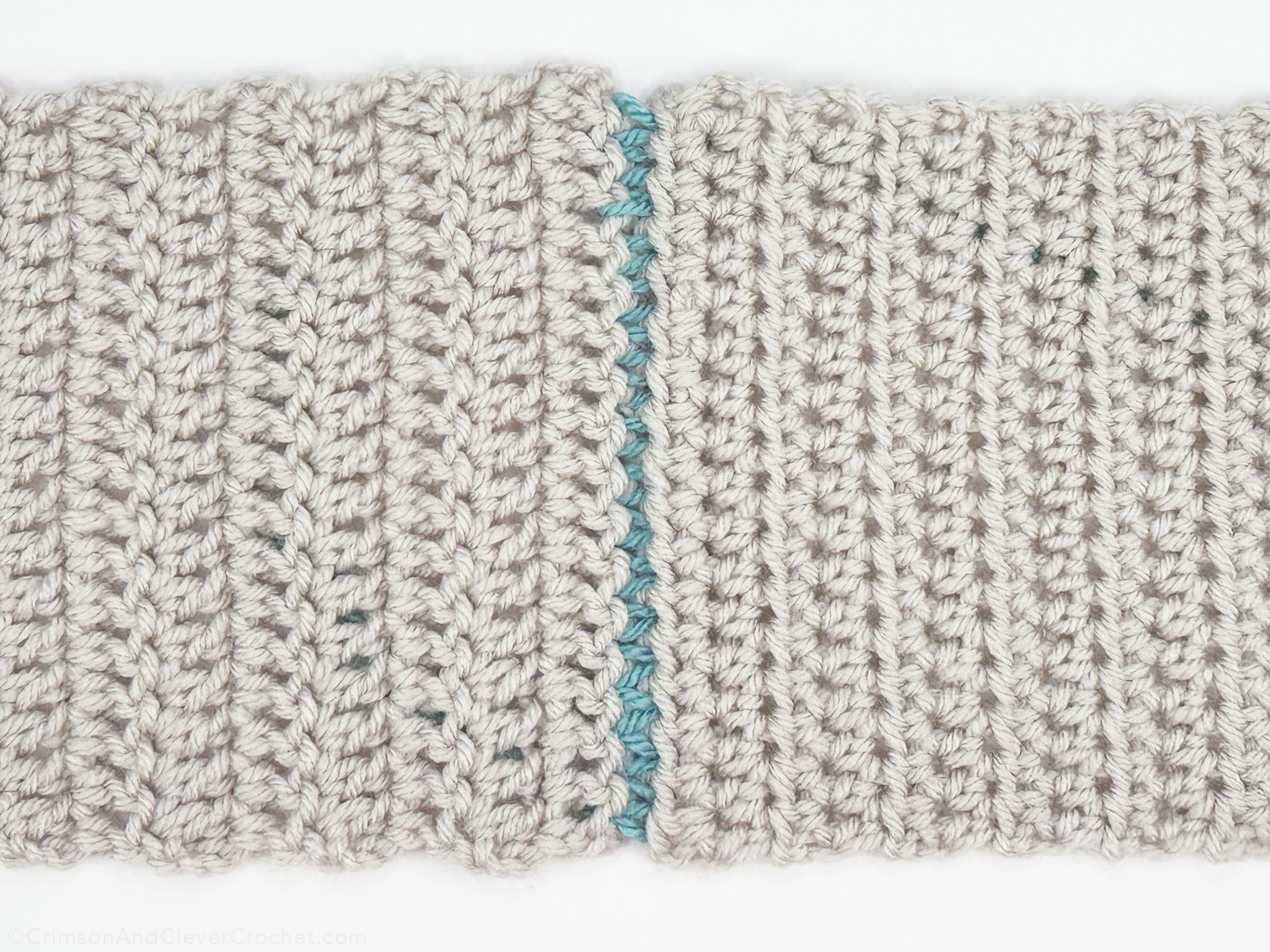 Above is the finished right side (RS) of the piece. Using the same color as both pieces would disguise the seam well, along with pulling it slightly tighter. Do you see the mistake I made? About 3 stitches down, you’ll see the yarn reaching further over to the left. This is because I grabbed too many loops when I was inserting my needle. For a consistent theme, be sure you are grabbing the same number of loops in the same place with every mattress stitch.
