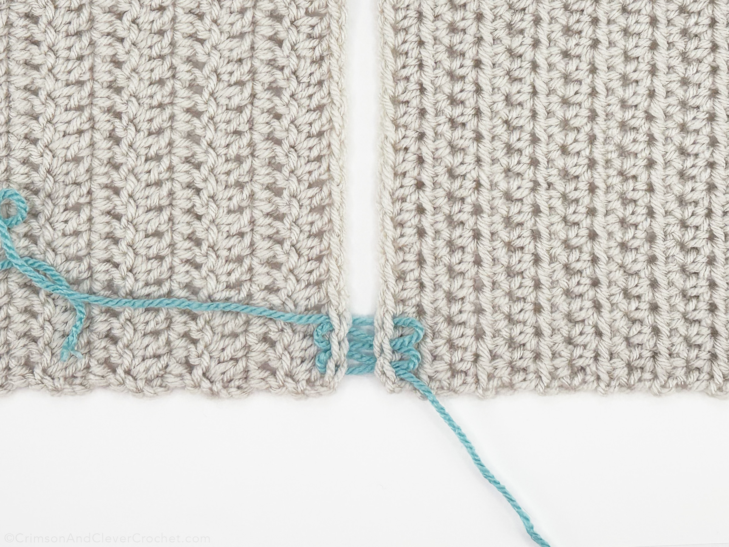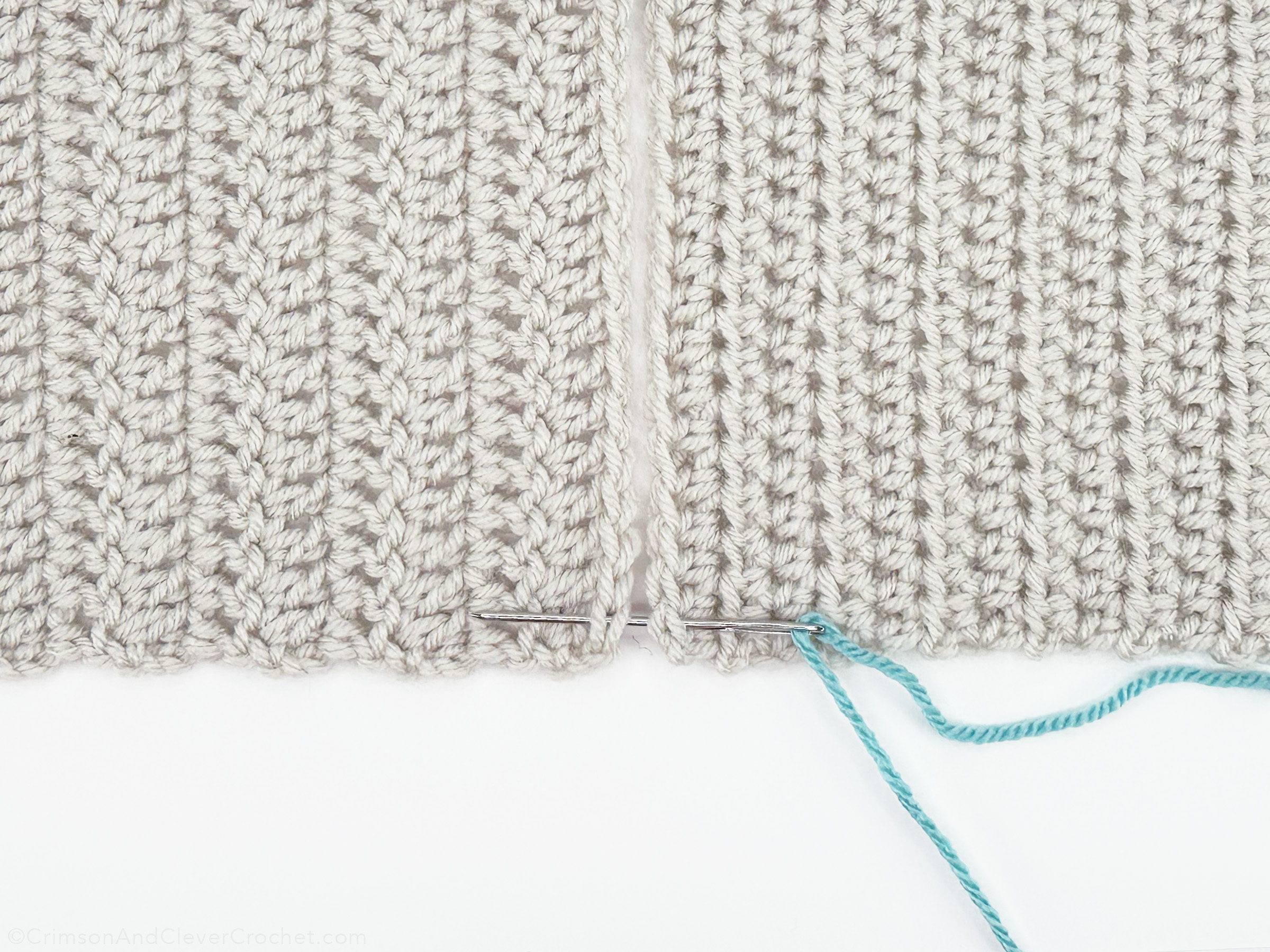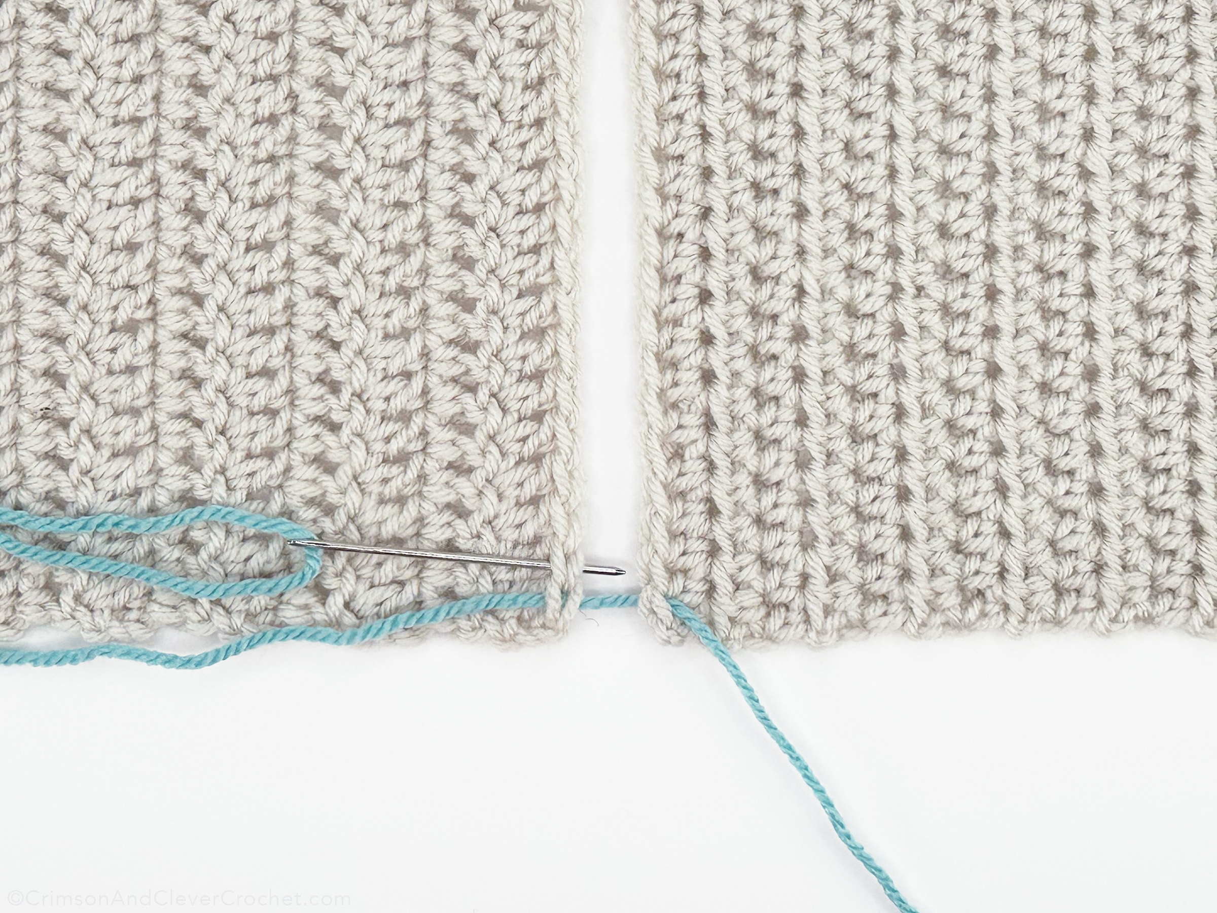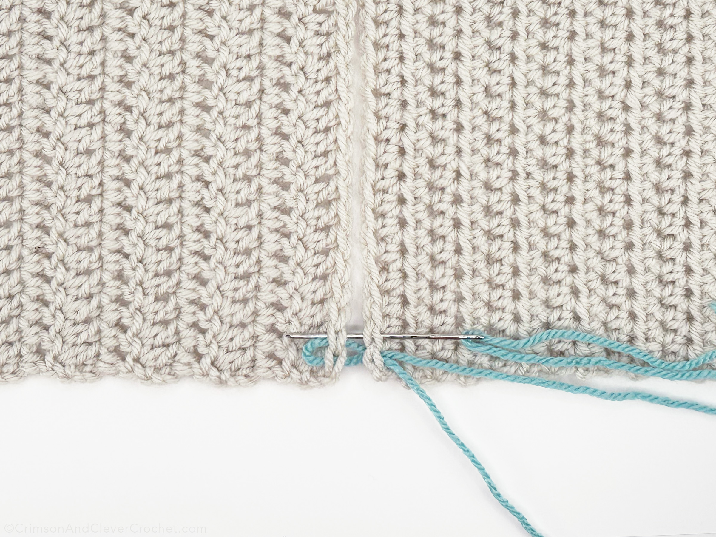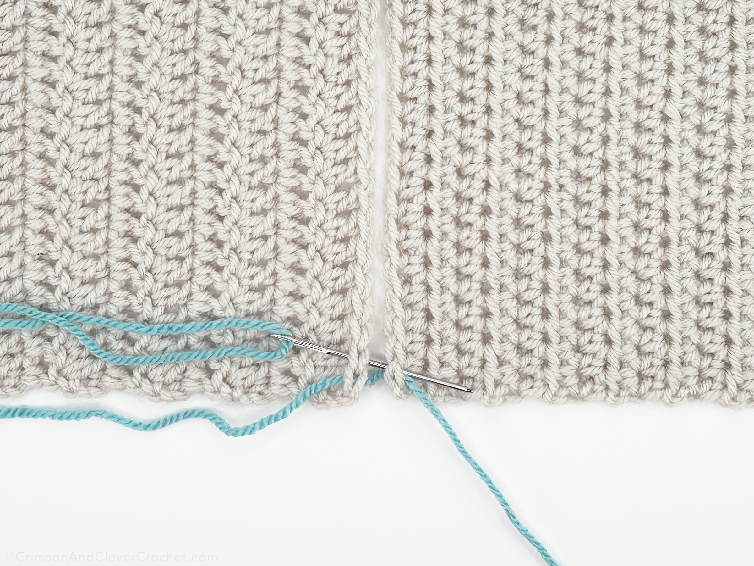 Insert needle from right to left into both loops of the stitches on each side. For a less bulky seam, you can insert into only one loop of each stitch, but keep it consistent!